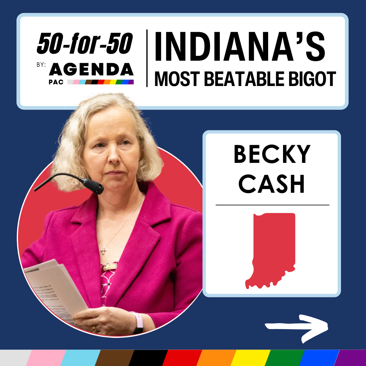 Becky Cash has spent her time in office pushing Indiana’s most extreme policies on her purple suburban district. She’s attacked LGBTQ+ kids, supported Indiana’s abortion ban, and worked to censor schools and libraries.